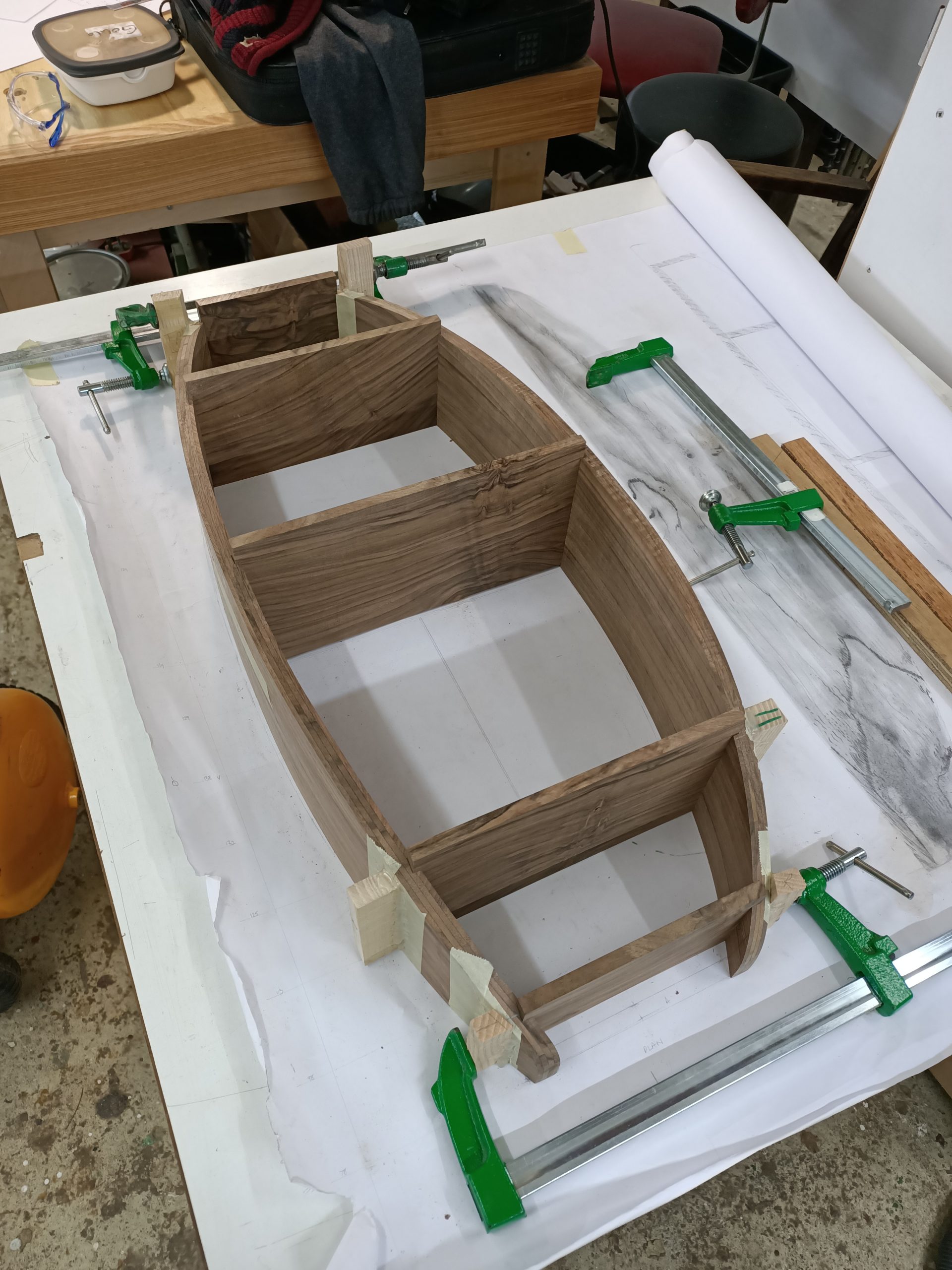 She then used these moulds to first press the hand-cut laminations of English Walnut in the vacuum bag press.