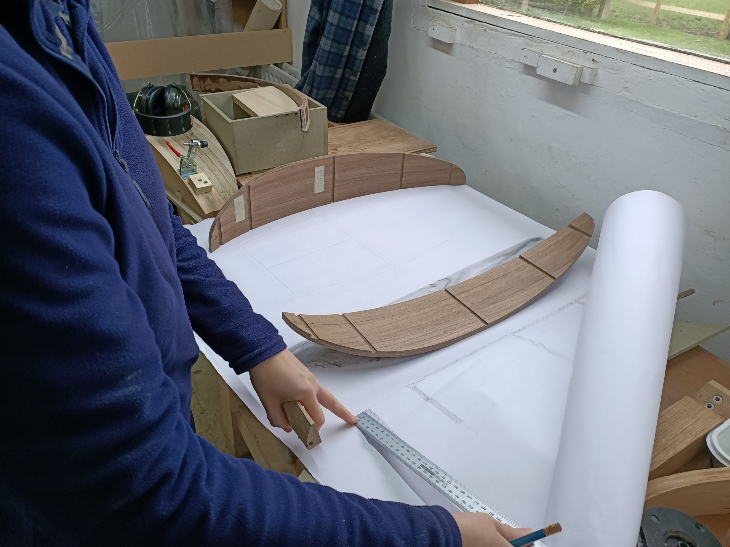 She started by hand-drafting the whole project on a drawing board. Then transferring this information onto working rods. These were used to make templates to cut the moulds.