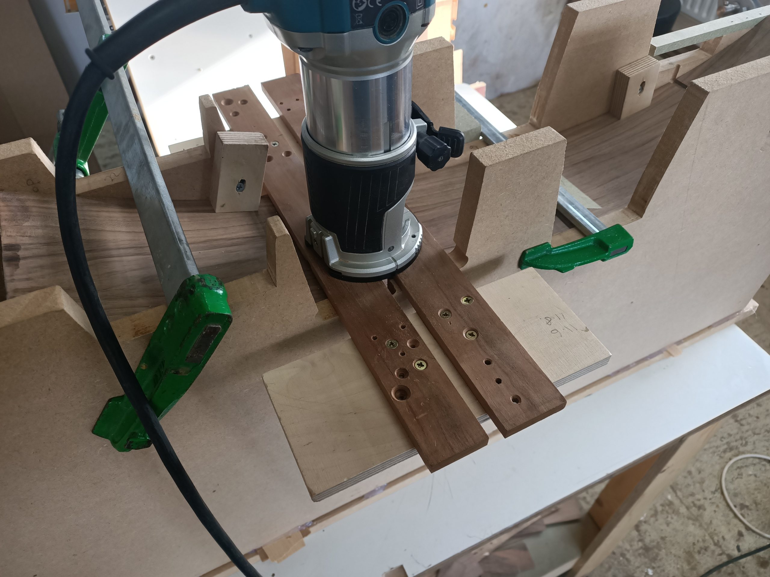 One of the more challenging processes in this project was figuring out how to cut the housing joint into the curved sides that the shelves would fit into. As their ends had to be perpendicular to the centre line of the cabinet. She achieved this by making the large jig as pictured.