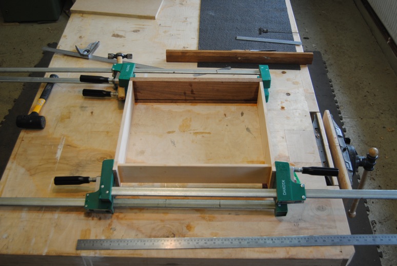 During the glue up process the drawers are checked for square. Then the clamps are removed and the drawers laid on a flat surface for the glue to set.