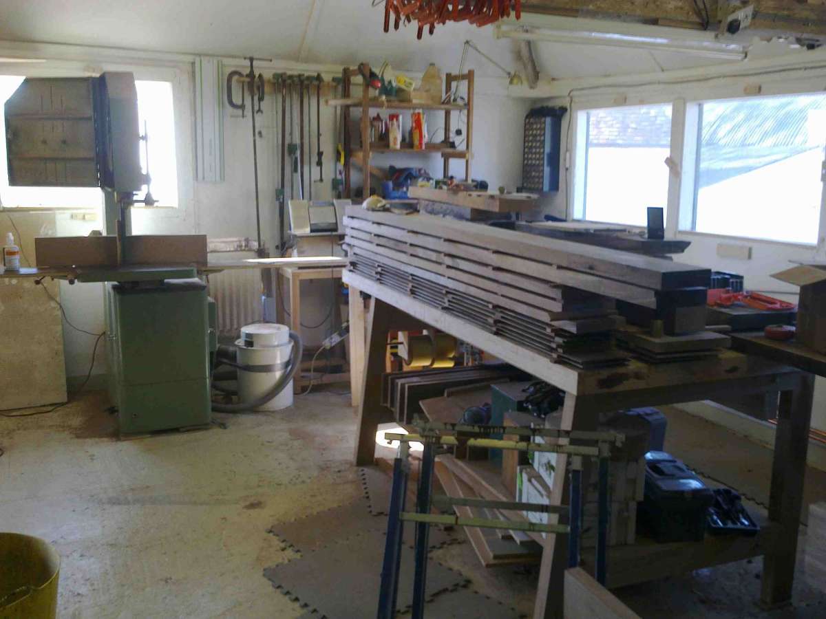 After all the main machining was completed the workshop was filled with stacked veneers, sideboard carcass components, and offcuts.