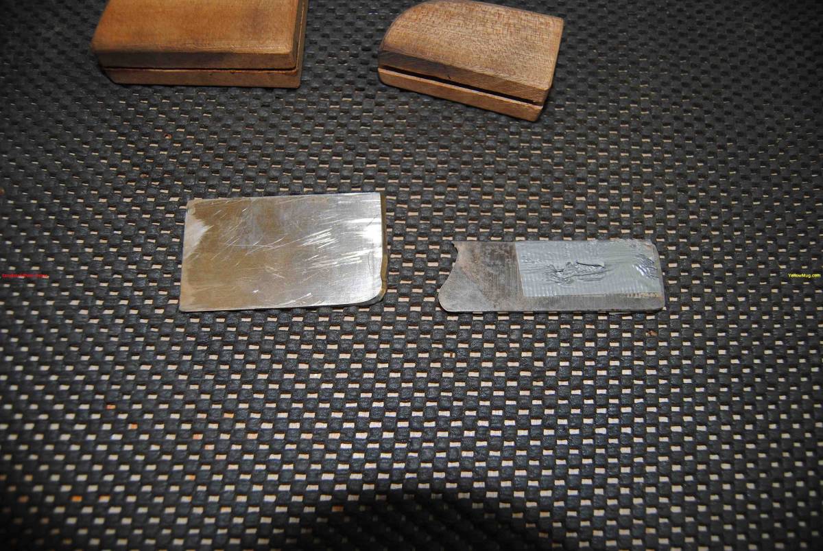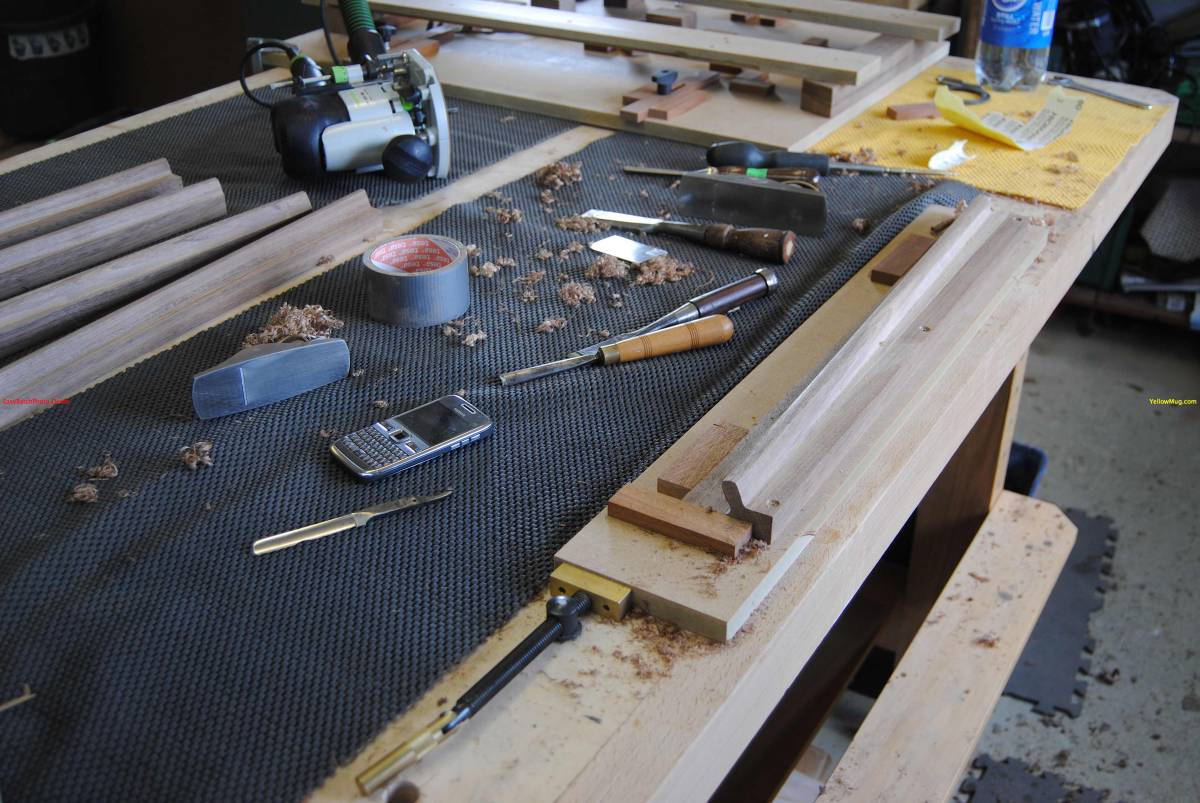 Shaping the sideboard door handles with purpose made scrapers cut from high carbon steel.
